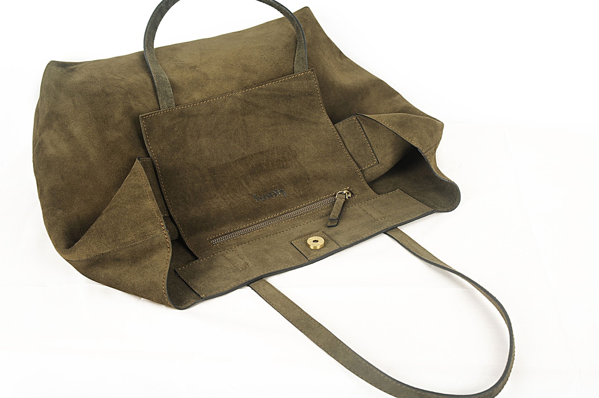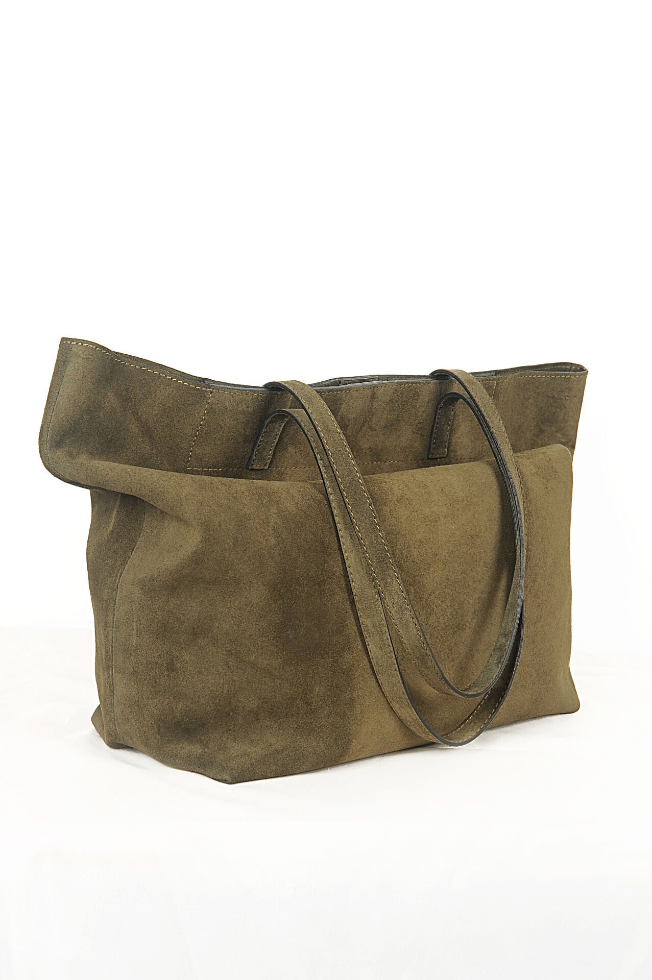 Süet el yapımı Haki el-omuz çantası, şıklığı ve kullanışlılığı bir arada sunar. Çıt çıtlı fermuarı, büyük iç cebi ve geniş hacmi ile eşyalarınızı güvenle taşır. 35 cm dip genişliği, 53 cm ağız genişliği ve 36 cm boyu ile tercih edilir. %100 hakiki deri süetten üretilmiş, 60 cm sap uzunluğuyla konfor sağlar. Temizliği süet silgisi veya fırça ile kolayca yapılabilir.